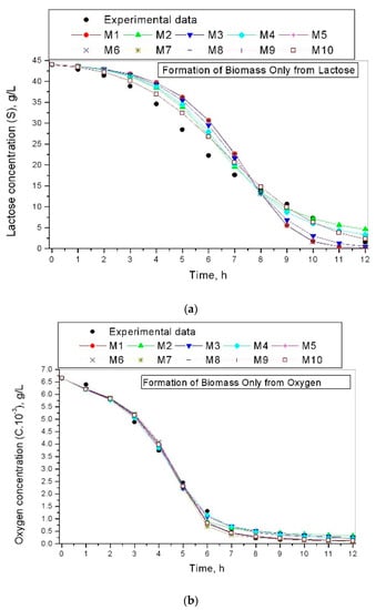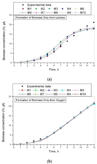 Formation of biomass from investigated models: (a) formation of biomass only from lactose; (b) formation of biomass only from oxygen.