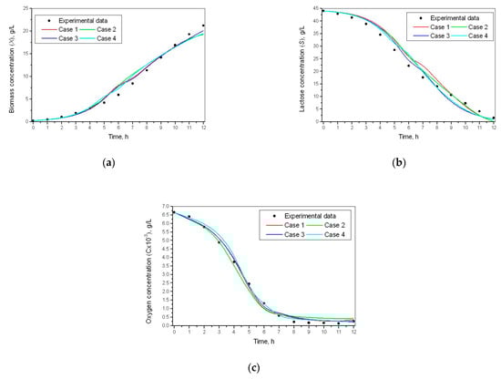 Figure 2a,b shows a similar situation to the reasoning made for Figure 1a,b. The modeling of the lactose concentration model (1)–(2) shows a relatively lower correspondence between the experimental and simulated results compared to the results obtained by models (3)–(4), shown in Figure 2b. These results show that the influence of oxygen on the cell growth kinetics is more than that of lactose.