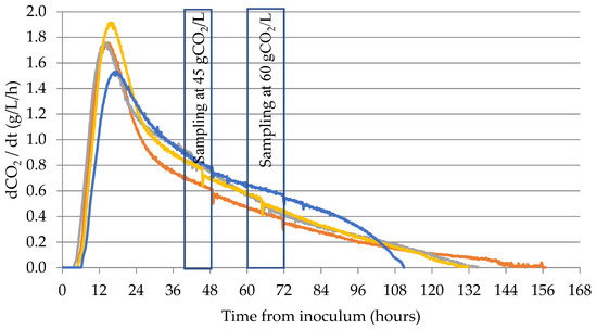 During the late fermentation phase, two samplings were performed at 45 g/L (half of the CO2 produced) and 60 g/L of CO2 produced. Due to differences in strain fermentation rates, these values were reached at different times.