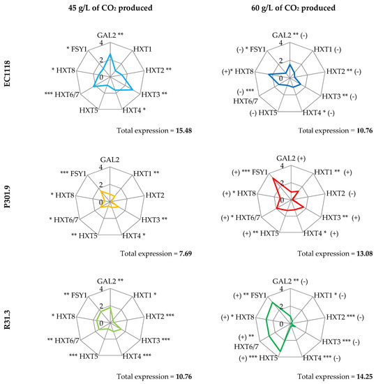 The global expression rate was calculated by summing the expression rate of each single gene analyzed. At 45 g/L of CO2 produced, EC1118 showed the highest expression rate (15.48) and strain R008 showed the lowest (6.35). EC1118 was the only strain that decreased the global expression rate at 60 g/L of CO2 produced (10.76), reaching a global expression rate value lower than P301.9 and R31.3 (13.08 and 14.25, respectively). R008, which left a sugar residue at the end of the fermentation, showed the lowest level of the global expression rate at both sampling times. Regarding the good fermenting yeasts (EC1118, P301.9, and R31.3), in the two vineyard strains, the expression of the tested genes increased at 60 g/L of CO2 produced. On the contrary, in EC1118, most of the tested genes showed a decrease of expression.