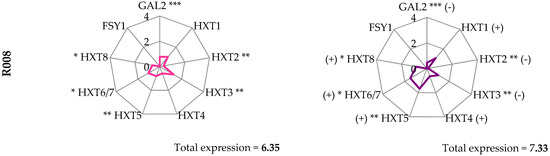 On the contrary, HXT4 expression showed a strain-mediated trend: Decreasing in EC1118 and markedly so in R31.3, constant in R008, and increasing in P301.9.