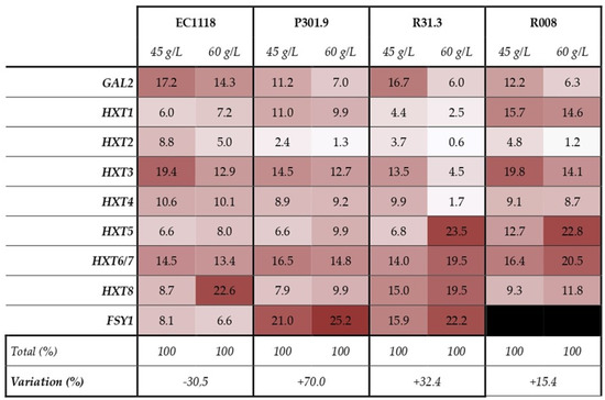 At 45 g/L of produced CO2, the most expressed genes in EC1118 were HXT3, GAL2, and HXT6/7. The expression pattern of HXT3 and HXT6/7 confirmed previous findings that assessed HXT3 as the most highly expressed HXT gene during alcoholic fermentation and HXT6/7, expressed throughout fermentation [40]. HXT3 and HXT8 (together with HXT1) were the most expressed gene in R008, although at lower levels than that of EC1118. Interestingly, in P301.9, the most expressed gene was FSY1 followed by HXT6/7 and HXT3; in R31.3, FSY1 showed an expression level similar to the most expressed genes, HXT8 and GAL2. At 60 g/L of produced CO2 in EC1118, a strong increase of HXT8 was registered, while in P301.9, FSY1 reached the 25% of the total gene expression. In R31.3, the GAL2 gene expression strongly dropped down, while FSY1, HXT8, HXT6/7, and HXT5 increased. Although the general low gene expression level in R008 caused an increase in the expression of HXT5 and HXT6/7, HXT8 was found (Figure 3).