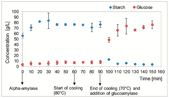 It was noted that, during the cooling period (60 to 90 min) from 80 °C to 70 °C, there was no crystallization of starch or sugars (constant concentrations). After glucoamylase was added and until 110 min, the concentration of starch decreased, which reinforced the suggestion that the glucoamylase enzyme decreased the effect of the product inhibition (oligosaccharides) of α-amylase by transforming it into glucose, which was reflected in the increase in reducing sugars.