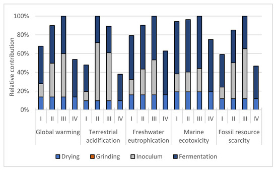 The relative results for five selected impact assessment categories for the scenarios and separately for the inoculum production process are presented in Figure 3 and Figure 4, respectively. The impact categories described in Figure 3 and Figure 4 are global warming, terrestrial acidification, freshwater eutrophication, marine ecotoxicity and fossil resource scarcity. The results for the remaining thirteen impact categories available in the ReCiPe characterization method [32] is available in Table 2.