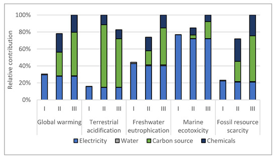 The results indicate that the carbon source used in the inoculum production is a hotspot in the majority of impacts categories in both Scenario II, which uses molasses and Scenario III, based on glucose (Figure 4). The carbon source is responsible for 36% and 51% of the impacts on the global warming impact category for Sc. II and Sc. III, respectively. In terrestrial acidification, the contribution is higher, 74% and 69% for Sc. II and Sc. III, respectively. Scenario I, conversely, uses stale bread as the carbon source, which is modelled as waste and is, therefore, burden-free.