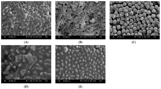 Representative scanning electron micrographs (SEM) at 10,000× of probiotic bacterial cells after freeze-drying owing to the addition of 3% low molecular weight collagen-peptide (LCP). (A): Lactoplantibacillus plantarum MG989, (B): Lactococcus lactis MG5125, (C): Enterococcus faecium MG5232, (D): Bifidobacterium animalis ssp. lactis MG741, and (E): Streptococcus thermophilus MG5140.