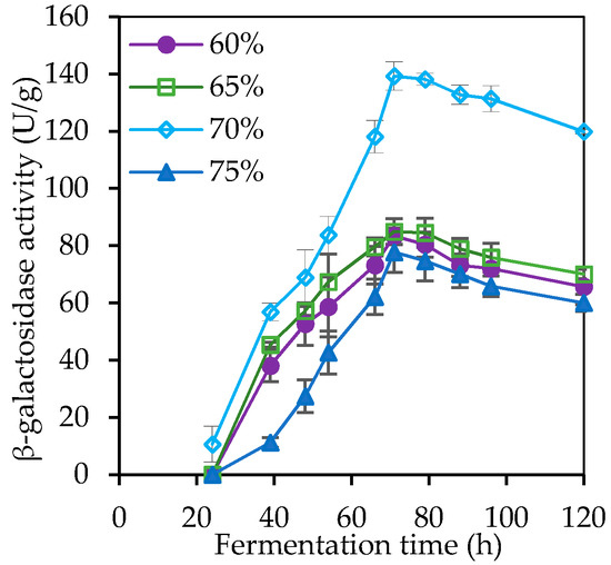Crude enzyme production was determined during solid state fermentations (SSF) on wheat bran (WB) and further optimized under various parameters. More specifically, 5 g WB (dry basis) were weighed and sterilized into 250 mL Erlenmeyer flasks. To enhance secretion of fungal β-galactosidase, the medium was supplemented with 10 mg ΜgSO4 in each SSF culture [13,29]. Suspensions of approximately 2 × 106 spores mL−1 were prepared by collecting spores of 5 days old fungal pre-cultures as described above. Inoculated WB flasks were incubated at 28 °C under static conditions and enzyme activity was determined at regular time intervals until 120 h of incubation. In terms of enzyme production optimization, different initial moisture content of the substrate of 60, 65, 70 and 75% (w/w on a dry basis) was also examined. The varying moisture content was fixed by addition of deproteinized whey (pH 4.5) in order to stimulate enzyme production.