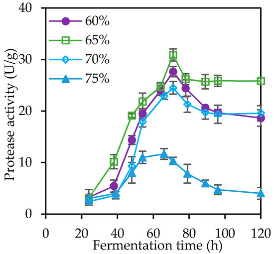 Figure 2. Effect of solid state fermentation (SSF) time in crude protease production by A. awamori, at different initial moisture contents.