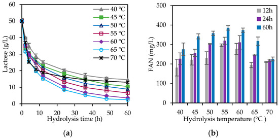Figure 3. Effect of temperature on cheese whey (CW) hydrolysis using crude β-galactosidase and proteases. Kinetics of (a) lactose hydrolysis and (b) free amino nitrogen (FAN) production.