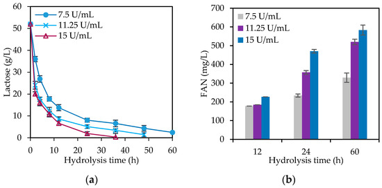 Figure 4. Effect of different initial enzymatic activity of crude β-galactosidase on cheese whey (CW) hydrolysis. Kinetics of (a) lactose hydrolysis and (b) free amino nitrogen (FAN) production.