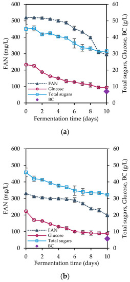CW constitutes a renewable, zero-cost substrate suitable for microbial fermentation, mostly requiring minimal pretreatment. However, often lactose does not undergo fermentation by several microorganisms including acetic acid bacteria. Previous reports demonstrated low BC-production from unhydrolyzed CW, thus hindering further implementation. Thus, pretreatment is often essential to overcome such limitations. Besides this, only limited studies have evaluated CW for BC production [55,56]. Based on similar literature reports, BC production is species and strain dependent. Evidently, the results of the current work confirmed the ability of A. xylinum to use CW hydrolysate under three different fermentation schemes. Hydrolysates derived from 11.25 (Hydrolysate A) and 7.5 U/mL (Hydrolysate B) crude β-galactosidase, respectively, were used to evaluate BC production, and the results are presented in Table 1. Different nitrogen concentrations were used, based on previous observations where elevated levels of nitrogen content induced cell proliferation at the expense of BC production [32]. As it can be seen in Figure 5a, the consumption of 13.91 g/L of glucose and 224.79 mg/L of FAN resulted in the production of 7.05 g/L BC (Hydrolysate A). Hydrolysate B followed a similar trend with respect to glucose consumption rate. The consumption of 13.41 g/L of glucose and 132.64 mg/L FAN, resulted in 5.78 g/L of BC production (Figure 5b). However, it is worth noting that in both experiments a considerable amount of sugars remained unfermented by A. xylinum. Therefore, a third treatment was deployed using diluted hydrolysate (hydrolysate C) (1:1 CW:H2O) in order to evaluate the BC production yield on approximately 25 g/L total sugar content and 260 mg/L FAN concentration (Figure 5c). In fact, in these experimental conditions, almost complete glucose consumption was attained along with the consumption of 114.94 mg/L FAN, achieving a final BC concentration of 5.59 g/L.
