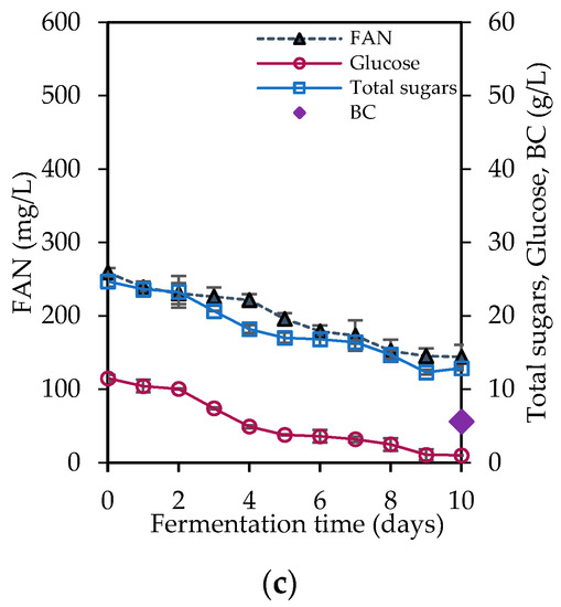Figure 5. Bacterial cellulose (BC) production and kinetics of sugars and free amino nitrogen (FAN) consumption, using different cheese whey (CW) hydrolysates. (a) Hydrolysate A; (b) Hydrolysate B; (c) Hydrolysate C.