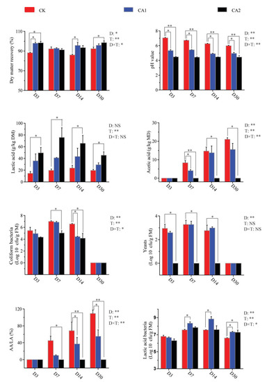 The fermentation parameters and microbial counts of mulberry leaf silages (D, ensiling days; T, treatments; D × T, the interaction of ensiling days and treatments; *, p < 0.05; **, p < 0.01; NS, non-significance; CK, the control; CA1, 1% citric acid; CA2, 2% citric acid; D3, 3 days of ensiling; D7, 7 days of ensiling; D14, 14 days of ensiling; D30, 30 days of ensiling; AA/LA, the ratio of acetic acid to lactic acid; cfu, colony-forming units; FM, pre-ensiled material).