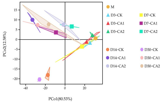 Principal component analysis of the bacterial community for mulberry leaf silages (M, pre-ensiled material; CK, the control; CA1, 1% citric acid; CA2, 2% citric acid; D3, 3 days of ensiling; D7, 7 days of ensiling; D14, 14 days of ensiling; D30, 30 days of ensiling).