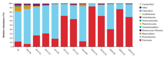 Bacterial community and relative abundance by phylum for mulberry leaf silages (M, pre-ensiled material; CK, the control; CA1, 1% citric acid; CA2, 2% citric acid; D3, 3 days of ensiling; D7, 7 days of ensiling; D14, 14 days of ensiling; D30, 30 days of ensiling).
