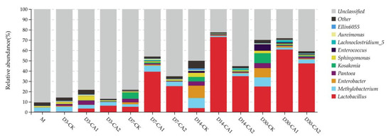 The dynamics of relative abundance among bacterial communities by genus are shown in Figure 4. The relative abundance of bacterial communities was very low in the pre-ensiled ML. Methylobacterium (4.01%) and Sphingomonas (1.03%) were the dominant genera in pre-ensiled ML, which was consistent with the results for pre-ensiled alfalfa reported by Ni et al. [34]. After 30 days of ensiling, Lactobacillus (24.9%), Kosakonia (9.67%), Enterobacter (8.96%), Methylobacterium (8.89%) and Enterococcus (6.26%) were dominant in the CK, whereas Lactobacillus was the only dominant genus in the silages treated with CA. Lactobacillus is usually the dominant genus in silage due to its more active and rapid growth when the environmental pH declines. Some Lactobacillus species are usually screened as inoculants due to their rapid growth, which enhances the fermentation quality, such as Lactobacillus plantarum and Lactobacillus casei [17,26]. The relative abundance of Lactobacillus increased from 0.4 to 24.9, 60.7 and 47.3% in the CK and the silages treated with 1% CA and 2% CA after 30 days of ensiling, respectively. In the same fermentation period, the silages treated with CA showed a higher Lactobacillus abundance, which was consistent with the higher accumulation of lactic acid content (Figure 1). Moreover, Lactobacillus abundance decreased in the silages treated with 1% CA after 14 days of ensiling, which might be due to the rapid depletion of fermentation substrates, which could not support the growth of Lactobacillus. The rapid depletion of fermentation substrate abundance might be responsible for the conversion of lactic acid to acetic acid in the silages treated with 1% CA because lactic acid becomes an alternative fermentation substrate for Lactobacillus. Similarly, Yan et al. [15] observed that relatively high Lactobacillus abundance corresponds to an elevation in acetic acid and a reduction in lactic acid. This conversion might be because different species of Lactobacillus have different metabolic patterns and functions. Similar to Lactobacillus, Enterococcus are desirable bacteria in the initial fermentation process, with the function of producing lactic acid to create a weak acid environment, which contributes to Lactobacillus fermentation. In the silages treated with CA, the relative abundance of Enterococcus decreased (Figure 5), which might be due to its low tolerance to the acidic environment caused by CA [17,23].