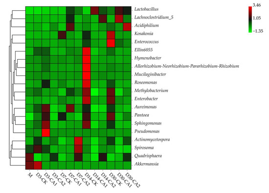 Heatmap of prominent bacterial genera (20 most abundant genera) for mulberry leaf silages (M, pre-ensiled material; CK, the control; CA1, 1% citric acid; CA2, 2% citric acid; D3, 3 days of ensiling; D7, 7 days of ensiling; D14, 14 days of ensiling; D30, 30 days of ensiling).