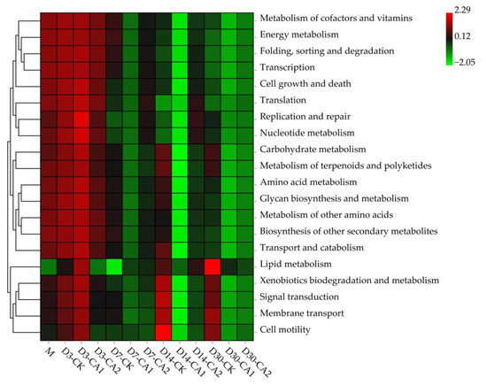 Heatmap of 16S rDNA gene-predicted functional profiles obtained with PICRUSt2 (M, pre-ensiled material; CK, the control; CA1, 1% citric acid; CA2, 2% citric acid; D3, 3 days of ensiling; D7, 7 days of ensiling; D14, 14 days of ensiling; D30, 30 days of ensiling).