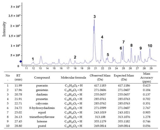 P. lobata is used as herbal medicine and food [,]. P. lobata has demonstrated a variety of results related to osteoporosis [,,,,]. Therefore, we evaluated the efficacy of fermented P. lobata, which contains various flavonoids, in the prevention of osteoporosis. In previous studies, it is confirmed that daidzein is converted to dihydrodaidzein and equol []. Furthermore, LC/MS qualitative analyses were performed to reveal other active components of FPE, especially isoflavones which are responsible for the strong inhibitory activities on osteoporosis. LC-MS analysis was conducted using the SCIEX Triple TOF 5600 (SCIEX) in positive ion mode. Using an HPLC system with a Kinetex F5 C18 column, the FPE were separated at a flow rate of 0.3 mL/min within 0 to 30 min. Each data set was processed with Analyst TF1.7 (SCIEX, Framingham, MA, USA) software. The total ion chromatograms (TIC) of FPE, including the name of each metabolite, retention time (RT), molecular formula, mass value, and accuracy, are shown in Figure 1. Particularly, puerarin, genistein, daidzein, calycosin, and equol are already known for their efficacy of anti-osteoporosis, respectively [,,,,]. Therefore, it is believed that FPE, which includes various effective components, can be valuable candidate for anti-osteoporosis.