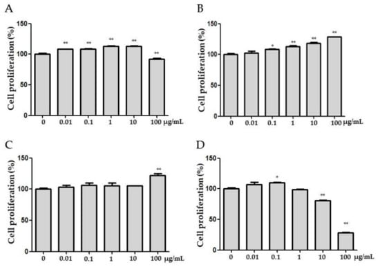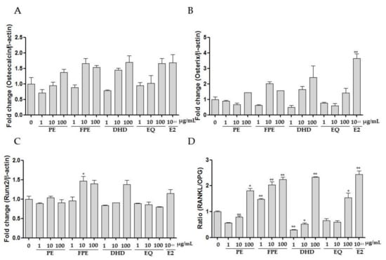 Proliferation activity in osteoblast MG63 cells. Effect of a variety concentration of (A) PE; (B) FPE; (C) DHD; (D) Equol on cell proliferation rate. * p < 0.05 compared to 0 µg/mL, ** p < 0.01 compared to 0 µg/mL. Data are means ± SEM of triplicates from one representative experiment.