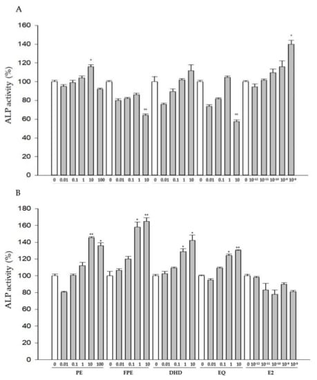 MG63 cells were maintained in a complete medium. Cells were seeded at 2 × 104 cells per well in 24-well plates. The medium was changed to a differentiation medium consisting of 10 mM glycerol 2-phosphate, 50 μg/mL ascorbic acid, and the indicated concentrations of PE, FPE, DHD, EQ, or E2 (0.01, 0.1, 1, 10, or 100 μg/mL final concentrations) in culture medium after 24 h of incubation. After 96, 120 h of treatment, the cells were washed with PBS, and assay buffer was added. The solution was centrifuged at 12,000 rpm for 15 min at 4 °C. The supernatant was transferred to 96-well plates, and 5 mM pNPP solution was subsequently added after incubation for 1 h at 25 °C. The reaction was stopped by adding a stop solution, and the absorbance was measured at 405 nm. ALP activity was presented as a percentage, which was compared with ALP activity in control cells.