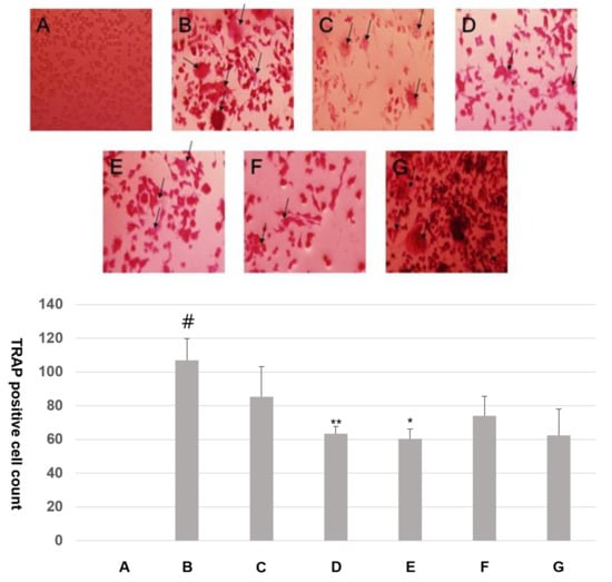 Osteoclast differentiation in osteoclast precursor RAW 264.7 cells: (A) Control; (B) RANKL 50 ng/mL + M-CSF 30 ng/mL; (C) RANKL/M-CSF + PE 100 μg/mL; (D) RANKL/M-CSF + FPE 100 μg/mL; (E) RANKL/M-CSF + DHD 10 μg/mL; (F) RANKL/M-CSF + EQ 10 μg/mL; (G) RANKL/M-CSF + E2 10−9 M 48 h after treatment. # p < 0.01 compared to control. * p < 0.05 compared to RANKL 50 ng/mL + M-CSF 30 ng/mL group. ** p < 0.01 compared to RANKL 50 ng/mL + M-CSF 30 ng/mL group.