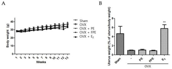 Effects of FPE on changes of body weight and uterus weight in OVX-induced mice. (A) Body weight was measured once a week; (B) at the end of the experiment, the uterus was removed and weighed. PE: Pueraria lobata extract; FPE: fermented Pueraria lobata extract. ** p < 0.01 compared to OVX induced control.