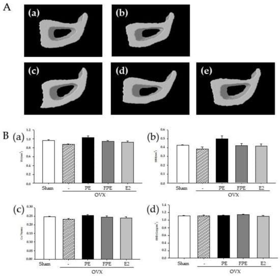 Micro-CT analysis of the cortical bone. (A) Micro-CT images of the cortical bone of the tibia; (a) sham; (b) OVX; (c) OVX + PE 100 mg/kg; (d) OVX + FPE 100 mg/kg; (e) E2; (B) (a) BV; (b) MMI; (c) Cs.Th; (d) BMD of OVX-induced mice treated PE, FPE, and E2.