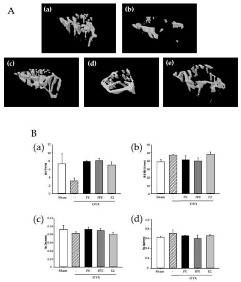 Micro-CT analysis of the trabecular bone. (A) Micro-CT images of the trabecular bone of the femur; (a) sham; (b) OVX; (c) OVX + PE 100 mg/kg; (d) OVX + FPE 100 mg/kg; (e) E2; (B) (a) BV/TV; (b) BS/BV; (c) Tb.Th; (d) Tb.Sp; (e) Tb.N; (f) Tb.Pf; (g) SMI; (h) BMD of OVX-induced mice treated PE, FPE, and E2.