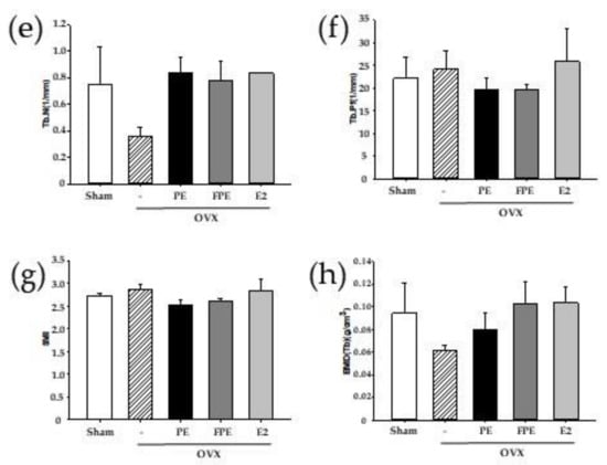 As illustrated in Figure 8A, OVX caused degradation of trabecular bone architecture compared to the sham group. However, treatment with PE and FPE retarded or recovered the destruction of femur trabecular bone in the OVX-induced bone loss mouse model. The protective effect on trabecular bone architecture was also clearly demonstrated by treatment with E2, a positive control. In addition, BV/TV, Tb.Th, Tb.N, and BMD were lower, whereas trabecular separation, BS/BV, Tb.Th, Tb.Pf, and SMI were higher than the sham group (Figure 8B). In both the PE, FPE, and E2 treatment groups, BV/TV, Tb.Th, Tb.N, and BMD were increased in sham-operated mice compared to those of the OVX group, while BS/BV, Tb.Sp, Tb.Pf, and SMI were decreased compared to those of the OVX group.
