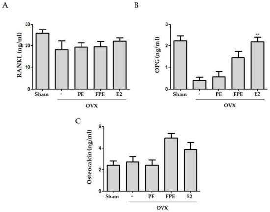 These results suggest that FPE was effective in preserving bone mass as well as in restoring the deterioration of bone microarchitecture associated with OVX mice. Analyses of the serum levels of OPG/RANKL and osteocalcin, biomarkers of bone resorption, were shown to be significantly higher than those of the sham group. In the present study, PE and FPE showed protective efficacy against OVX-induced osteoporosis. It is hypothesized that the FPE could be effective in inhibiting the bone resorption process. Since the balance between the RANKL and OPG produced by osteoblasts is critical for osteoclast regulation, we determined serum levels of RANKL and OPG by ELISA (Figure 9). In the OVX group, serum levels of RANKL were decreased, whereas OPG was decreased compared to that of the sham group. Our results indicate that FPE treatment significantly increased the level of OPG; however, it did not affect the level of RANKL. As a consequence, the RANKL/OPG ratio was significantly decreased by FPE treatment. On the other hand, osteocalcin, which is the most abundant protein in bone matrix after its synthesis by osteoblasts, increased dramatically following FPE treatment compared to other groups. This suggests that FPE most likely prevented bone loss through decreased bone turnover.