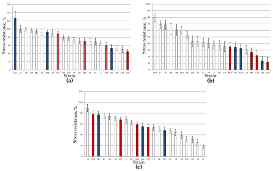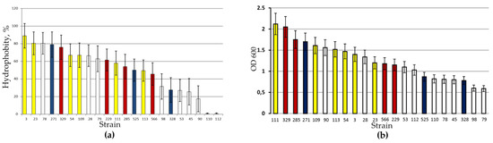 Figure 3 shows the results of the analysis of the adhesive properties of the strains using two tests. The first analyzes the distribution of cells between the aqueous phase and a hydrophobic organic solvent, isooctane. The higher the degree of hydrophobicity of cells, the greater their fraction will be present in the organic phase. The second test measured the ability of cells to bind to polystyrene, which also positively correlates with adhesion properties. The high hydrophobicity of the cell surface in the test with isooctane (>50%) was demonstrated by environmental strains 3, 23, 78, 54, 109, 28, 79, 111, 113, flor strains 329, 229, and 285, and wine strains 271 and 525. Most of these strains were also among the leaders in the test for adhesion to polystyrene (Figure 3b).