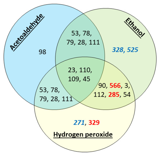 The results of the analysis of the degree of resistance of the strains to the stress agents used are presented in Figure 1. Contrary to expectations, it turned out that flor yeast strains were not “leaders” in any of the tests, yielding in the degree of resistance to wine strains and environmental isolates. To select strains with cross-resistance to different toxic agents, the following criteria were chosen: ethanol resistance >63%, hydrogen peroxide resistance >42%, acetaldehyde resistance >50%. With this grouping, 6 strains were simultaneously resistant to ethanol and peroxide stresses, 5 strains were resistant to ethanol and acetaldehyde, and 4 strains were resistant to all three toxicants (Figure 2). Flor strains from the collection were present only in the first set. At the same time, only some environmental isolates that were previously selected using a combination of genetic markers with subsequent assessment of oenological characteristics [29] turned out to be resistant to all three stress agents.