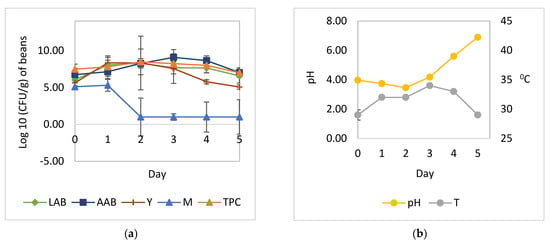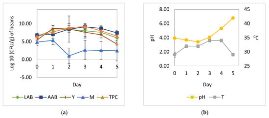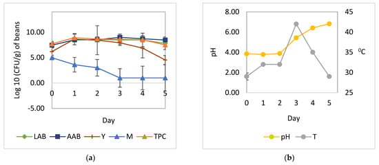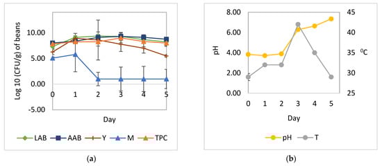 Microbial growth patterns and changes in pH and temperature during the natural fermentation of cocoa beans: (a) growth of yeast, LAB, AAB, and mold; (b) temperature and pH. LAB, total lactic acid bacteria; AAB, total acetic acid bacteria; Y, total yeast; M, total mold; TPC, total plate count; pH, pH pulp; T, temperature.