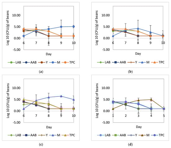 The growth patterns of C. famata HY-37, L. plantarum HL-15, Acetobacter spp. HA-37, and A. niger YAC-9 can be seen in Figure 5. The use of L. plantarum HL-15 as a starter culture was able to inhibit mold growth during fermentation and drying. The population of A. niger YAC-9 increased on drying days 8 and 9, but at the end of the drying, it decreased by about 4 logs for the cocoa beans fermentation with L. plantarum HL-15 or in combination with C. famata HY-37 and Acetobacter spp. HA-37 (Figure 5b,d). During the cocoa bean fermentation without the addition of C. famata HY-37, L. plantarum HL-15, and Acetobacter spp. HA-37 (Figure 5a,c), the A. niger YAC-9 population continued to increase until the end of drying (day 10).