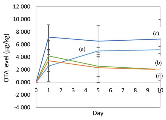 The OTA concentration during fermentation (days 0, 1, and 5) and drying (day 10): (a) natural fermentation; (b) fermentation of cocoa beans with the addition of L. plantarum HL-15 and A. niger YAC-9 as a contaminant; (c) fermentation of cocoa beans with the addition of A. niger YAC-9 as a contaminant; (d) cocoa bean fermentation with the addition of a mixed starter culture consisting of L. plantarum HL-15, C. famata HY-37, Acetobacter spp. HA-37, and A. niger YAC-9 as a contaminant. (b,d) show lower levels of ochratoxin contamination than those of (a,d). This shows that there was a good effect from the addition of the LAB.