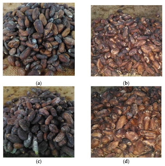 The appearance of fungal mycelia on the surfaces of the dry cocoa beans (days 10): (a) natural fermentation; (b) fermentation of cocoa beans with the addition of L. plantarum HL-15 and A. niger YAC-9; (c) cocoa bean fermentation with the addition of A. niger YAC-9; (d) cocoa bean fermentation with the addition of a mixed starter consisting of L. plantarum HL-15, C. famata HY-37, Acetobacter spp. HA-37, and A. niger YAC-9. There were no fungal mycelia in the treatments in (b,d). The color of the fermented cocoa beans that were contaminated by A. niger was blackish brown, as shown in (a,c).