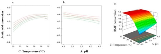 (a) Effect of the fermentation temperature and pretreatment condition on the acetic acid conversion (green = acid hydrolysis, red = hydrothermal), fermentation conditions: pH = 5.5, 100 rpm, t = 24 h; (b) Effect of the fermentation pH and pretreatment condition on the acetic acid conversion (green = acid hydrolysis, red = hydrothermal), fermentation conditions: pH = 5.5, 100 rpm, t = 24 h; (c) Effect of the fermentation pH (A) and temperature (C) on the HMF conversion.