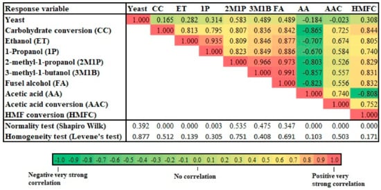 Figure 2 shows the Spearman correlation coefficient (RHO) among response variables. RHO is employed when there is a mixture that is normally and non-normally distributed [,]. According to the Shapiro−Wilk test, shown in Figure 2, the following variables were not normally distributed: carbohydrate conversion (CC), ethanol concentration (ET), 1-propanol concentration (1P), acetic acid concentration (AA), acetic acid conversion, and HMF conversion (p < 0.05). On the other hand, yeast, 2-methyl-1-propanol concentration (2M1P), 3-methyl-1-butanol concentration, and total fusel alcohol concentration were normally distributed. Here, a positive correlation between ethanol and acetic acid conversion was observed (RHO = 0.674). The positive correlation showed that acetic acid could act as substrate to produce ethanol [], as explained above. The consumption of acetic acid along with an increment on the ethanol production was also observed by Wei et al. [] during the co-fermentation of synthetic culture based on glucose and using S. cerevisiae strain at 30 °C.