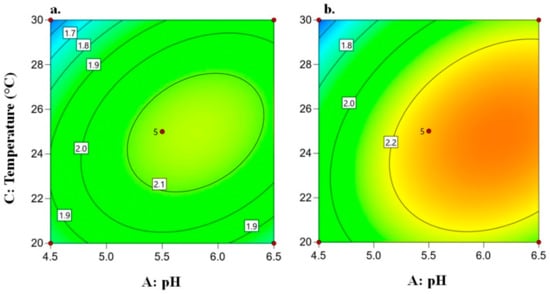 The initial yeast cell viability for all the experiments was 6.56 ± 0.13 Log CFU/mL. According to statistical results described in Table 4 and Table 5, yeast cell viability was mainly affected (p < 0.05) by the interaction between pH and temperature (AC, in Table 4), the interaction between pH and hydrolysis (AD, in Table 4) and the quadratic terms of both pH (A2, in Table 4) and temperature (C2, in Table 4). The β coefficients depicted in Table 5 show that the square term of temperature (C2, β = −0.21) had the strongest influence, followed by the square term of pH (A2, β = −0.16), the interaction between pH and temperature (AC, β = 0.11), and the interaction between pH and hydrolysis (AD, β = 0.06). Figure 3a shows that there is a maximum yeast cell viability at 25 °C and at a pH of 5.5 when sugarcane press-mud was pretreated under hydrothermal conditions. Thus, eliciting that significant effect of the square term of temperature reflects a maximum yeast cell viability at a specific temperature and pH value. A similar result was observed by Heard and Fleet [] and Lu et al. []. Figure 3 shows an average increment of 2.14 ± 0.22 Log CFU/mL and 1.97 ± 0.23 Log CFU/mL when sugarcane press-mud was pretreated under hydrothermal and acid hydrolysis conditions, respectively. A decrease in the yeast cell viability was observed at higher temperatures, possibly associated with the accumulation of ethanol that has a toxic effect on the yeast cell []. However, a successful adaptation of the microorganism is represented by an increment in almost 2 Log units []. Therefore, S. cerevisiae was fruitfully adapted, regardless of the pretreatment conditions, to the classical yeast medium formed by peptone, yeast extract, MgSO4·7H2O, Ca3(PO4)2, and (NH4)2SO4, where the carbon source was sugarcane press-mud, an agro-industrial residue with high content of fermentable sugars such as sucrose and glucose.