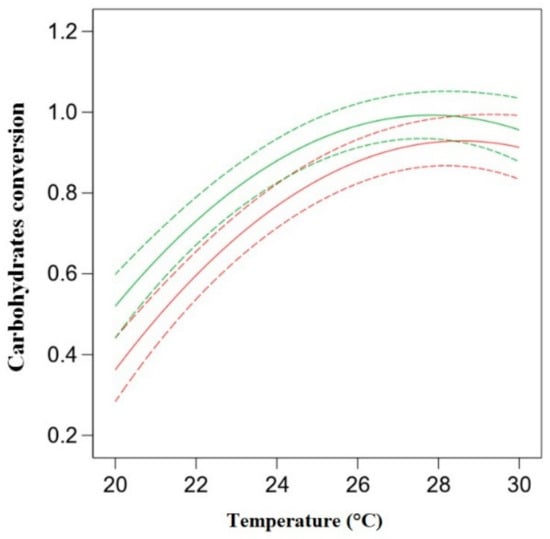 Table 6 shows that the initial carbohydrate content was 146.10 ± 17.47 GE/L and 134.45 ± 38.60 GE/L after the pretreatment under hydrothermal and acid hydrolysis conditions, respectively. ANOVA depicted that there was not a significant difference between the carbohydrate content for both pretreatment conditions. This result agrees with previous results obtained during fermentation of sugarcane press-mud under different pretreatment conditions []. Sugarcane press-mud is a feedstock rich in carbohydrates (i.e., 22.95 wt.% carbohydrates), as shown in Section 2.1. Sucrose is the main sugar present in sugarcane press-mud, as has been previously reported [,]. The content of fiber is low in comparison with the carbohydrate content. Indeed, fiber concentration in sugarcane press-mud is about 2.0 wt.%, as shown in Section 2.1. Fiber refers to cellulose, hemicellulose, and lignin []. Under acid hydrolysis conditions, fiber fractions could decompose, thus producing hexoses such as glucose and galactose and pentoses such as xylose and arabinose []. However, due to the low content of fiber in comparison with other carbohydrates, the contribution of fermentable sugars from fiber decomposition will be negligible. The pretreatment of sugarcane press-mud increases the content of reducing sugar, such as glucose and fructose, to ease the fermentation process []. Under acid hydrolysis conditions, the amount of reducing sugar will be higher than under hydrothermal conditions due to the activity of H+. Figure 4 shows that carbohydrate conversion during fermentation at 20 °C of hydrolysates obtained through acid hydrolysis of sugarcane press-mud was higher than that observed after the fermentation of hydrolysates obtained through hydrothermal conditions. However, at temperatures above 25 °C, carbohydrate conversion was similar, regardless of the pretreatment condition. As described above, sucrose and glucose are the main sugars present in the hydrolysates from sugarcane press-mud, while sucrose must be converted into glucose and fructose by an invertase enzyme []. Glucose is directly metabolized by yeast through the glycolytic pathway []. Glycolytic enzymes such as phosphoglucose isomerase, phosphofructokinase, and pyruvate kinase are not strongly affected by temperature [], while invertase activity is highly affected by temperature []. Therefore, at a higher glucose concentration and lower temperature, yeast will uptake carbohydrates faster than when there are at low glucose levels and high sucrose content. However, an increment on the fermentation temperature will rise the invertase activity, thus producing glucose and keeping similar carbohydrate conversion.