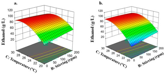 Concerning the effect of stirring, Figure 5a,b shows that stirring had a more notable effect at 20 °C, since an increment of the stirring speed caused a rise in the ethanol concentration. Stirring is an important fermentation variable because it promotes homogeneity and allows contact between the free yeast cells, suspended in the fermentation culture, and the substrate []. Poor stirring leads to a low mass transfer coefficient and consequently affects fermentation performance []. At higher fermentation temperatures (>26 °C), the effect of mechanical agitation is hampered, possibly ascribed to the formation of CO2. Under aerobic conditions and high glucose concentration, S. cerevisiae displays the Crabtree effect. This effect is associated with the use of both respiration and fermentation pathways to produce ATP []. Mixing the culture will improve mass transfer, consequently enhancing the dissolving of oxygen and boosting the Crabtree effect []. Besides, CO2 bubbles, produced metabolically by yeast, create an agitation environment that might favor the mass transfer effects during fermentation [,]. Since CO2 production is metabolically correlated with ethanol, the higher the fermentation temperature is, the higher the ethanol production, and consequently the higher the CO2 will be. Hence, at temperatures higher than 26 °C, an agitation effect might be associated with CO2, and the effect of external agitation becomes negligible.