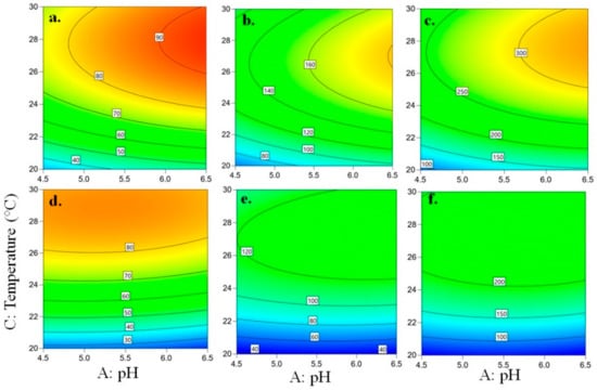 Table 5 shows that among the main factors, the square term of temperature (C2) had the greatest influence on the production of fusel alcohol (β = −135), followed by pretreatment conditions (β = 51.1), stirring (β = 43.5), and pH (β = 35.7). Since pH did not influence the ethanol production during fermentation, as shown in Table 3, we plotted contour diagrams to describe the effect of pH, temperature, and pretreatment on the concentration of main fusel alcohol. Figure 6 shows that the highest production of main fusel alcohol was found at a temperature of about 26 °C. The effect of temperature on fusel alcohol has been previously described by other authors [,,] and is associated with the gene expression of BAT1, which encodes for the enzymes involved in the transamination of amino acids, the first reaction in the Ehrlich pathway [,]. Moreover, the effect of pretreatment is clear on the fusel alcohol concentration. For instance, the production of higher alcohols was higher under hydrothermal conditions (Figure 6a–c) than under acid hydrolysis conditions (Figure 6d–f). This effect was previously reported during the fermentation of hydrolysates of sugarcane press-mud and was possibly linked to enzyme competition between the fusel aldehydes, which are intermediary in the Ehrlich metabolic pathway, and the HMF [].