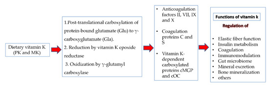 Vitamin K is an essential fat-soluble vitamin that entails a class of structurally analogous compounds, which are defined in two main types: phylloquinone (K1 or PK, a plant-based form that exists primarily in leafy vegetables) and menaquinones (K2 or MK, a collection of isoprenologues mostly originating from bacterial synthesis, e.g., MK-7 or tissue-specific conversion of PK and/or menadione in animals and humans, e.g., MK-4) [1]. Vitamin K is a ligand for the nuclear steroid and xenobiotic receptor [2]. As illustrated in Figure 1, the vitamin K life cycle starts in the endoplasmic reticulum where dietary PK and MK forms of the vitamin undergo post-translational carboxylation of protein-bound glutamate (Glu) to γ-carboxyglutamate (Gla). Then, the vitamin K epoxide reductase enzyme reduces vitamin K into vitamin K hydroquinone 2 (KH2) [3]. Vitamin K acts as co-enzymes of γ-glutamyl carboxylase (GGCX), transforming under-carboxylated in carboxylated vitamin K-dependent proteins, e.g., carboxylated osteocalcin (cOC)/bone Gla protein (BGP) and matrix Gla protein (MGP) [4,5]. cOC promotes calcium transportation and fixation in bones. It also protects against age-related musculoskeletal deteriorations by promoting the release of adiponectin and the anti-inflammatory cytokine interleukin (IL)-10 and inhibiting inflammatory cytokines such as IL-6 and tumor necrosis factor-α [6]. cOC and cMGP protect against pulmonary and vascular elastic fiber degradation [4,7]. They also contribute to the regulation of glucose and lipid metabolism through the modulation of insulin signaling and adipokines. Additionally, they protect against vascular calcification through their ability to regulate vascular mineralization and prevent the formation of calcium crystals via a mechanism that involves inhibiting the transdifferentiation of vascular smooth muscle cells (VSMC), modulating calcification by VSMC-derived matrix vesicles and apoptotic bodies, and preventing calcium-phosphate precipitation [3,7,8,9]. The active form of vitamin K is involved in the coagulation cascade by regulating the synthesis of different clotting factors (II, VII, IX, and X) [10]. It also activates anticoagulant proteins C and S, which prevent the development of clotting by inhibiting the activity of essential coagulation factors [6].