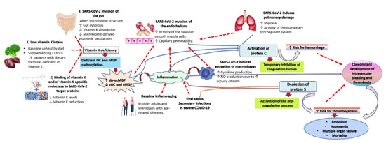 Activation of protein C occurs in response to vascular injury, increasing the tendency for bleeding [50,51,52]. The cytokine storm potentiates the prevalence of sepsis in COVID-19 patients, especially those who are old and nutritionally deficient [68]. Therefore, the levels of protein S may quickly drop due to SARS-CoV-2-induced septicemia, which is likely to activate procoagulants such as Factor VIII, fibrinogen, and D dimer [66,68]. Thus, the inflammatory milieu, along with dysregulation in the coagulation cascade, promotes a deadly positive thrombo-inflammatory feedback loop with a concomitant occurrence of thrombosis and hemorrhage in small vessels [6,69]. The pro-coagulant state in COVID-19, along with its related intravascular disseminated coagulation and embolization, evokes severe hypoxia, which causes the fast and fatal progression of the disease [66]. The mechanisms underlying alterations in proteins associated with vitamin K deficiency and their association with vascular injury and COVID-19 pathogenesis are described in detail in other more focused resources [4,8,9].
