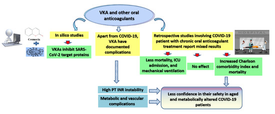 Summary of research findings on the possible effects of vitamin K antagonists (VKA) and other oral anticoagulants on COVID-19-related outcomes. While molecular simulation studies report efficient binding of VKA to target proteins of SARS-CoV-2, retrospective studies report inconsistent findings, with many of them pinpointing higher mortality in COVID-19 patients with a history of VKA treatment. In addition, the literature confirms the development of metabolic, vascular, and coagulopathy complications among non-COVID-19 patients treated with VKA. Thus, VKA may deteriorate the prognosis of COVID-19, given their vitamin K inhibitory activity.