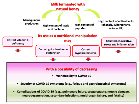 In addition to being a source of vitamin K, milk supplemented with honey (4%) when fermented by Lactobacillus helveticus MTCC5463 demonstrates a maximum production of bioactive peptides [136]. As noted above, peptides in fermented milk promote signaling involved in redox balance [33]. Thus, the fermented honey-milk mixture may represent a sound source of protein for symptomatic COVID-19. These patients usually undergo excessive protein loss due to SARS-CoV-2-induced inflammation/oxidative stress, metabolic imbalance, as well as reduced food intake and nutrient loss due to gastrointestinal injury [25,28,31].