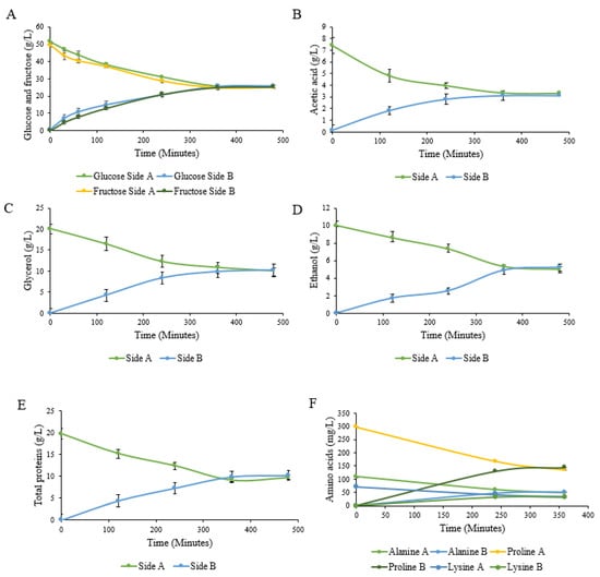 Graphs showing the change in concentration of amino acids in mg/mL over time in vessels A and B. The data represent the mean ± standard deviation (n = 3).