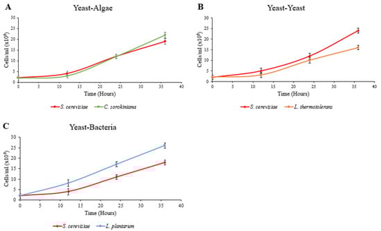 The growth of the microbial species was measured using hemocytometer cell counts every 12 h for 36 h for the yeast and microalgae co-culturing, and plate counts for the yeast and bacterial co-culturing. Samples were also plated out from the vessels onto WL, MRS and TAP media to ensure that no movement of species between the vessels or contamination had taken place. These plates were incubated at 25 °C for 3 days before counting.