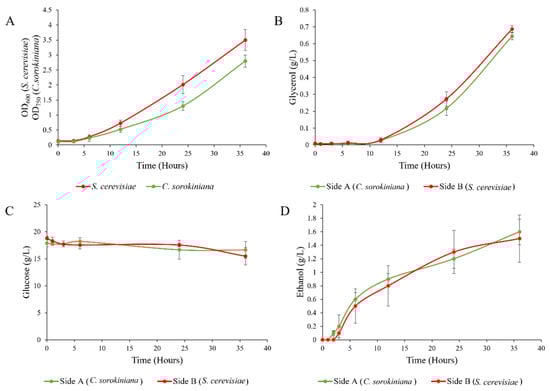 The yeast–microalgae system was selected for further metabolic analysis to observe the production and utilization of various metabolites in an indirect contact experiment. The growth of both species was monitored using OD600 and OD750 for S. cerevisiae and C. sorokiniana, respectively. Samples were plated out every hour for the first 12 h, and every 6 h thereafter to check for any movement of partner species across the membrane.